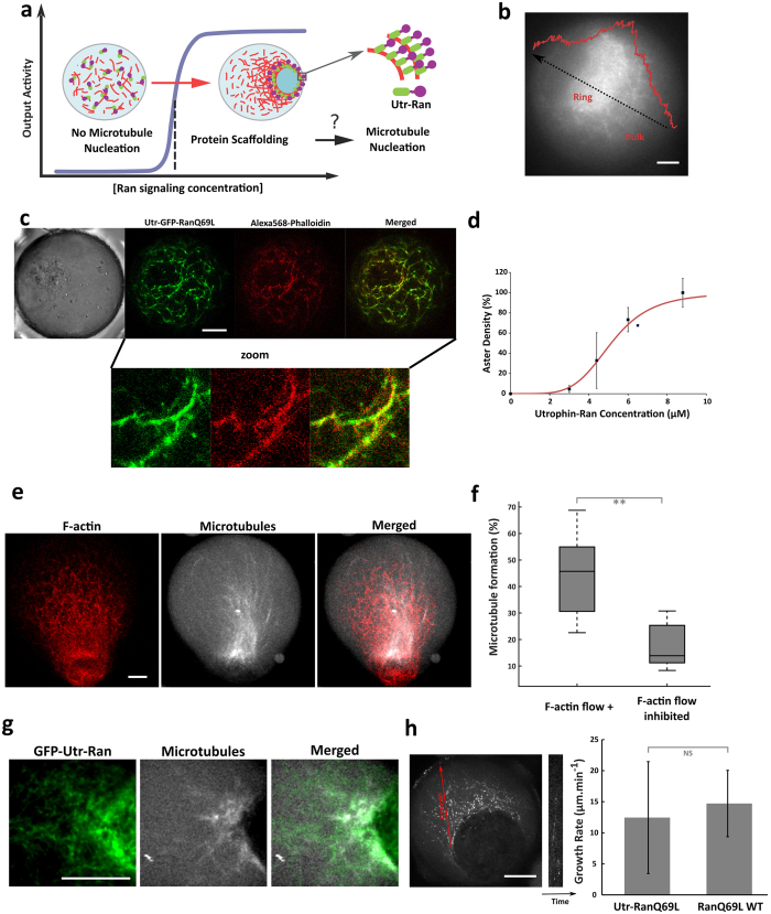 Figure 5. Signaling switch mediated by F-actin polymeric scaffolds.(a) Principle of the proof-of-concept experiment examining how F-actin could act as polymeric scaffold hubs to recruit regulatory proteins. RanQ69L is fused to the CH domain of utrophin to target F-actin filaments. Contraction and F-actin density increase may drive the concentration increase of Utr-Ran in a restricted area to trigger microtubule polymerization. (b) Evaluation of the fold increase in density of F-actin meshwork after contraction. (c) Co-localization of Utrophin-emGFP-RanQ69L (green) with F-actin meshwork (Alexa-568 Phalloidin, red). (d) Utr-RanQ69L induces microtubule assembly in confined extracts with a sigmoidal concentration dependency. (e) Confocal observation of microtubule formation induced by Utr-RanQ69L under nucleation threshold (500ânM) in confined extract. Microtubules are stained with rhodamine-labeled tubulin, and F-actin with Utr-GFP. (f) Quantification of the efficiency of the signaling switch mediated by F-actin flow: number of droplets containing microtubule arrays with F-actin flow and with the inhibition of F-actin flow. Observations were done with confocal microscopy. (g) Confocal observation of microtubules induced by GFP-Utr-Ran under nucleation threshold (500ânM). Microtubules are stained with rhodamine-labeled tubulin. (h) Left: typical kymograph extracted from steric trapping occurs within 5âminutes (Fig. 2b and Movie 3. Microtubules are labeled with EB1-GFP. Right: quantitative analysis of the growth rate extracted from the kymographs. Growth rates were measured for microtubules assembled using Utr-RanQ69L that are recruited to F-actin scaffolds (initial concentration at 500ânM) and using RanQ69L (6âμM). Mean and standard deviation are plotted. The measured growth rates are similar between these two pathways for growth (Utr-RanQ69L and RanQ69L). Scale bars are 10âμm. |