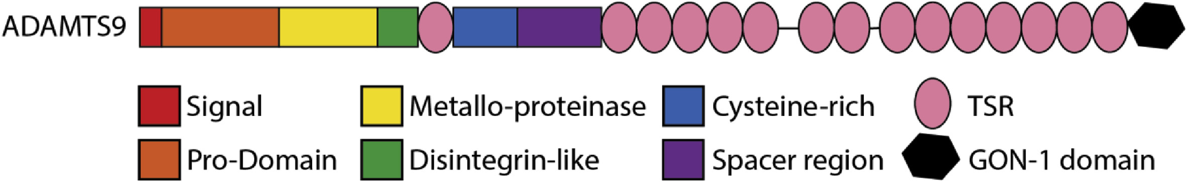 Molecular structure of ADAMTS9. The basic ancillary domain has a central TSR, a cysteine-rich domain and a spacer region. The carboxy (C)-terminal region of the ancillary domain is the most variable between the ADAMTSs containing one to fourteen additional TSR motifs and specific domains defining different sub-groups. Names of the different domains are indicated below the diagrams. |