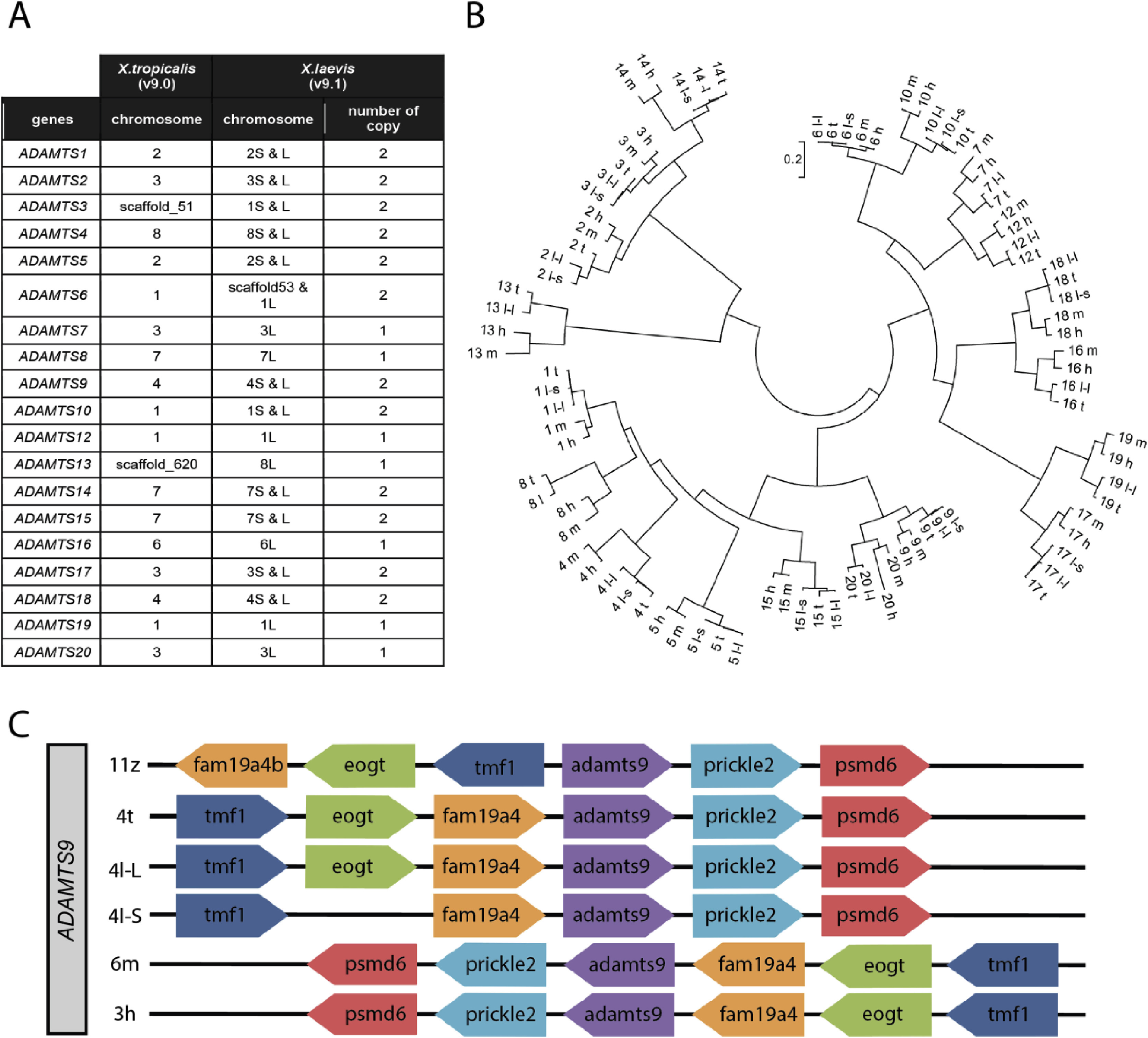 (A) Chromosomal location of ADAMTS genes in Xenopus laevis and Xenopus tropicalis. Chromosome number followed by an L for the longer and an S for the shorter indicate X. laevis gene location on the two subgenomes. Scaffold number is indicated for the genes without a chromosomal location. (B) Evolutionary relationships of the ADAMTS proteins. The evolutionary history was inferred by using the Maximum Likelihood method based on the JTT matrix-based model (Jones et al., 1992). The tree with the highest log likelihood (−21183.6512) is shown. Initial tree(s) for the heuristic search were obtained automatically by applying Neighbour-Join and BioNJ algorithms to a matrix of pairwise distances estimated using a JTT model, and then selecting the topology with superior log likelihood value. The tree is drawn to scale, with branch lengths measured in the number of substitutions per site. The analysis involved 88 amino acid sequences. All positions containing gaps and missing data were eliminated. There were a total of 355 positions in the final dataset. ADAMTS proteins are indicated by a number followed by a single letter code indicating the species: for example, ADAMTS1 t represents 1 from Xenopus tropicalis; 2 l-l and 2 l-s represent ADAMTS2 from Xenopus laevis subgenome L and subgenome S respectively; 3 h is ADAMTS3 from Homo sapiens; 4 m is ADAMTS4 from Mus musculus. (C) Synteny of ADAMTS9 in zebrafish, X. laevis subgenomes L and S, X. tropicalis, Mus musculus and Homo sapiens genomes. Chromosome number is indicated on the left followed by a z for zebrafish, an l with L and S for the longer and shorter X. laevis subgenomes, respectively, a t for X. tropicalis, a m for M.musculus and a h for H.sapiens. |