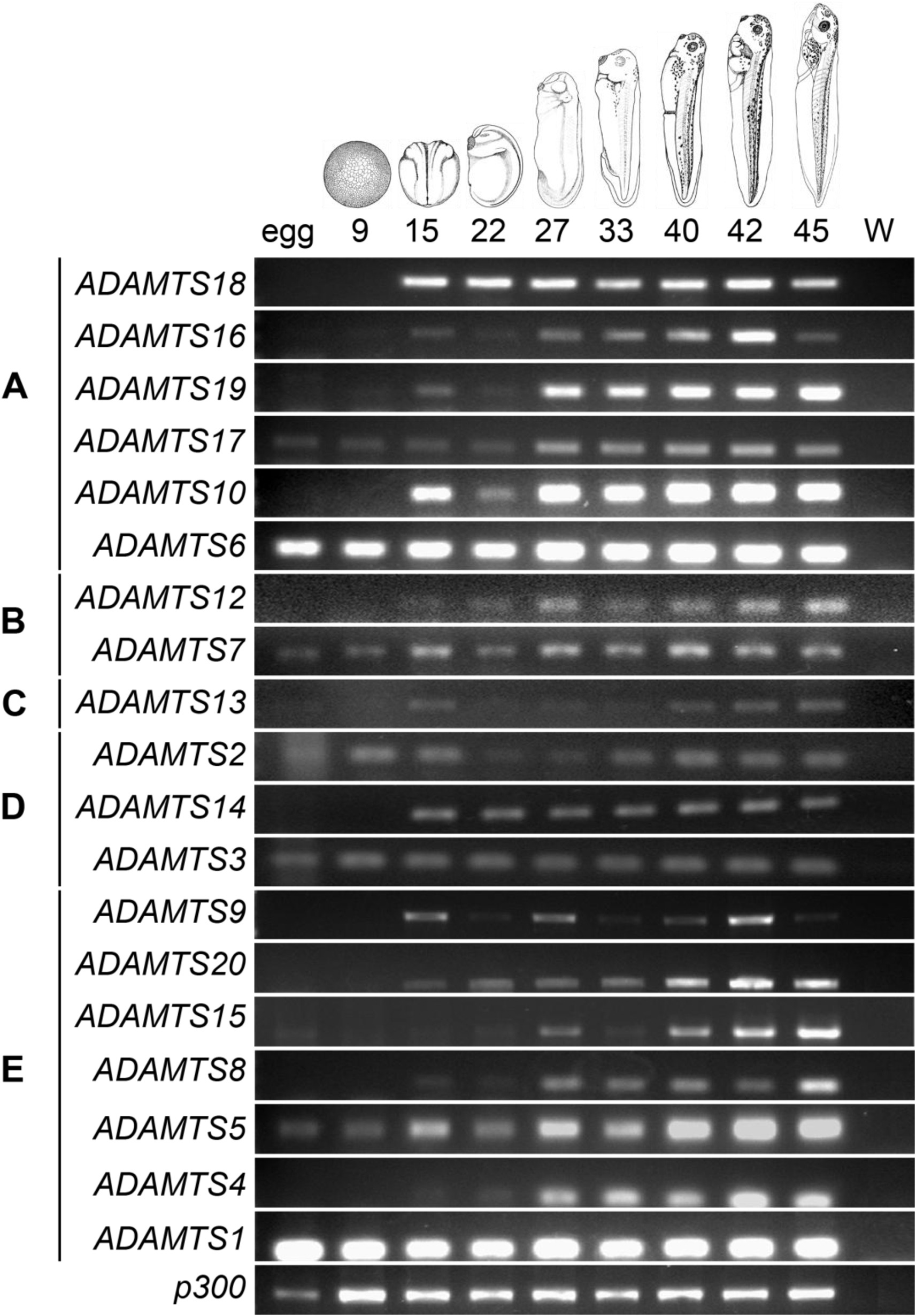 Analysis by RT-PCR of mRNA from egg to stage 45. Xenopus stages are indicated at the top according to (Nieuwkoop and Faber, 1994) (NF) and gene names are indicated on the left. W: water (H20), is a negative control and p300 is a loading control. ADAMTS genes are organised by clade as follow, (A) orphan, (B) COMP proteinases, (C) vWFCP, (D) Procollagen N-propeptidase and (E) Hyalectanases. |