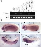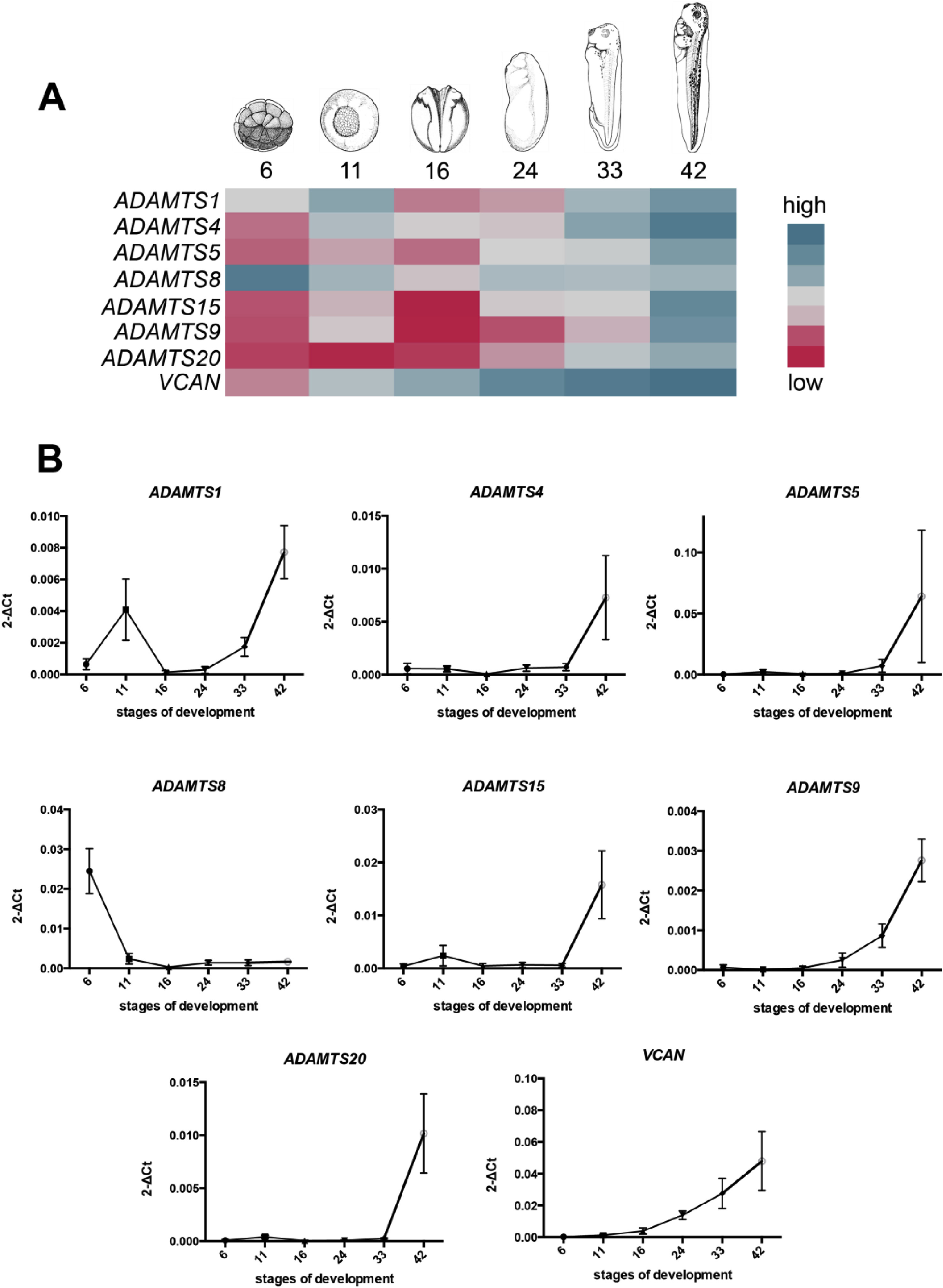 Analysis by qRT-PCR of mRNA from stage 6 to stage 42 embryos normalized to odc as a loading control. The experiment was done three independent times. Expression profiles are represented as, (A) a heatmap where genes names are on the vertical axis and developmental stages on the horizontal axis according to (Nieuwkoop and Faber, 1994) (NF). (B) Each graph represents the expression profile of a single gene; the numbers on the vertical axis represents the normalized expression value and on the horizontal axis represents stages of development (mean with SEM), nâ¯=â¯3.