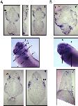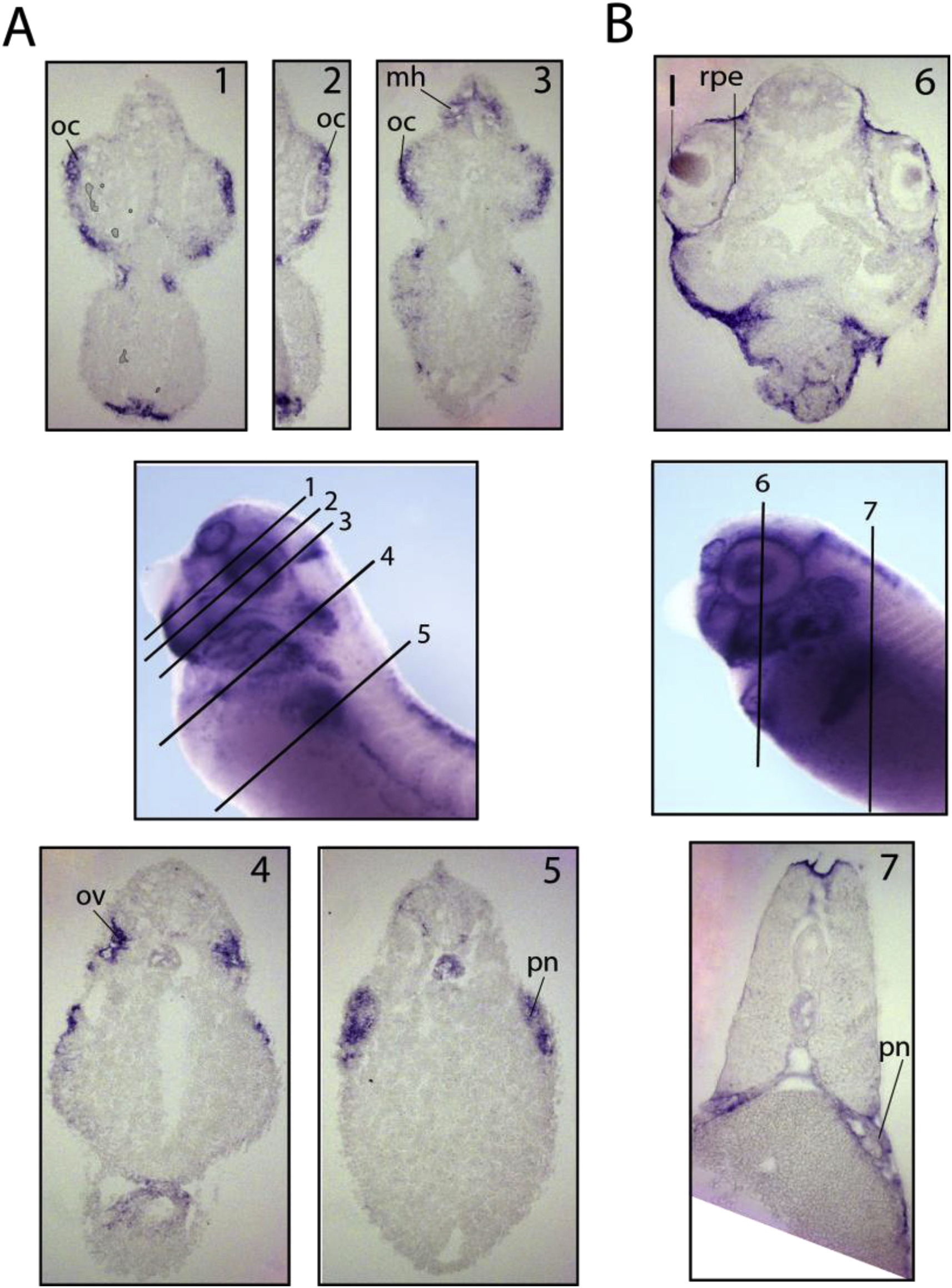 Sectioned Xenopus laevis embryos after WISH for ADAMTS9. Developmental stages are according to (Nieuwkoop and Faber, 1994). In each panel lines and numbers indicate the level of the sections. Embryos are shown with anterior on the right and sections with dorsal at the top. (A) At stage 35, (1, 2, 3) in the head the expression is in the optic cup (oc), in the midbrain hindbrain boundary (mh) and (4) in the otic vesicle (ov); in the trunk (5) the expression is in the pronephros (pn). (B) At stage 38, (6) in the head the expression is in the lens (l) and in the retinal pigment epithelium (rpe); in the trunk (7) the expression is in the pronephros (pn). |