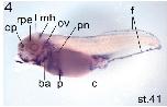 adamst9 (ADAM metallopeptidase with thrombospondin type 1 motif 9) gene expression in Xenopus laevis embryo, assayed via in situ hybridization, NF stage 41, lateral view, anterior left, dorsal up. |