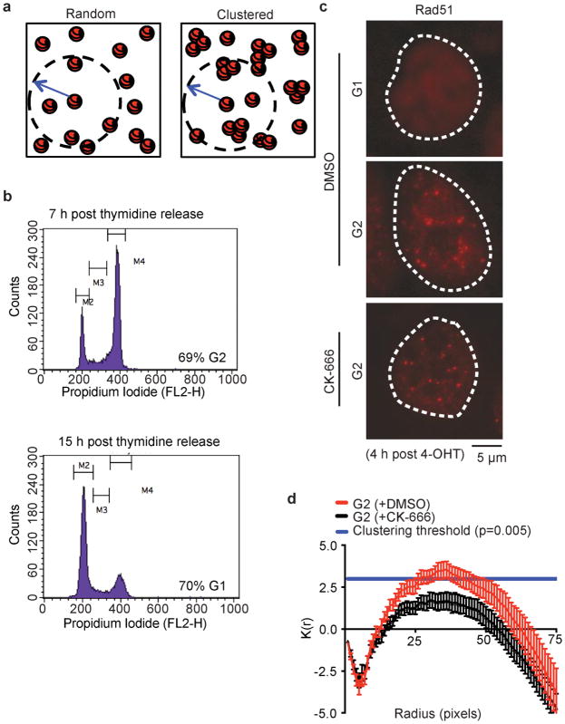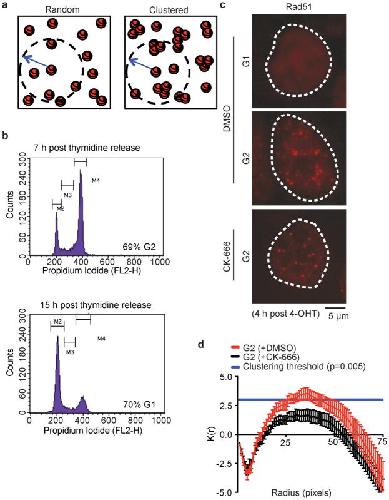 Extended Data Fig. 3. Arp2/3 clusters Rad51 focia, Schematic of clustering events. b, Representative cell cycle distribution of U2OS cells following double-thymidine block (out of five independent experiments). c, Representative images of U2OS-AsiSI nuclei showing Rad51 foci. d, Rad51 foci clustering in G2 cells (P calculated by Spatial analysis plug-in; data shown as mean and s.e.m. of Ripley function; DMSO n=95 nuclei, CK-666 n=80 nuclei). |