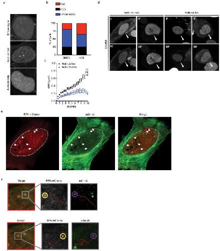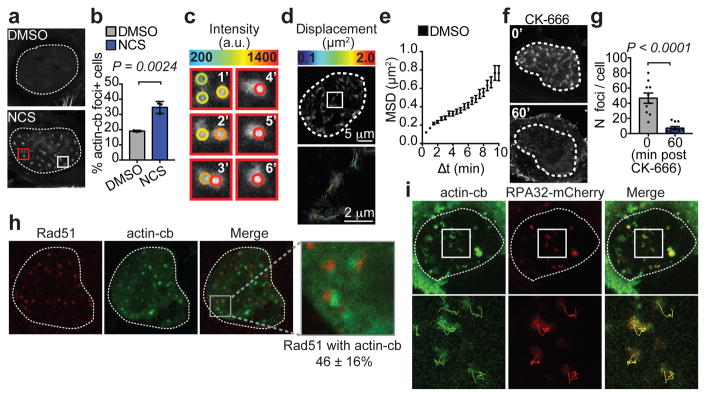 Figure 4. Nuclear actin foci cluster and localize to HDR sitesa, Representative images of U2OS nuclei transfected with nuclear actin-chromobody-tag-GFP (actin-cb). Boxes indicate clustering events. b, Percentage of actin-cb foci positive cells (P calculated by Student’s two-tailed t-test; data shown as mean and s.d.; n=473 nuclei (DMSO), 473 nuclei (NCS). c, Expanded images of a clustering event from (a, red box). Circles denote foci intensity. d, Representative traces of actin-cb foci (out of 3 independent experiments) over 10 min. e, MSD of actin-cb foci (Data shown as mean and weighted s.e.m.; DMSO n=662 foci from 11 nuclei). f, Representative images of a U2OS nucleus with actin-cb foci following CK-666 treatment. g, Quantification of actin-cb foci prior to and post CK-666 treatment (P calculated by paired two-tailed t-test; data shown as mean and s.e.m.; n=10 nuclei from 2 independent experiments). h, Representative images of a U2OS nucleus showing Rad51 co-localization with actin-cb foci. The percentage of Rad51 foci that overlap or touch actin-cb foci shown (n=12 nuclei). i, Representative images of a U2OS nucleus (from five independent experiments) showing traces of RPA32-mCherry-NLS foci (red) and actin-cb foci (green). Scale bar is 5 μm or as shown. |