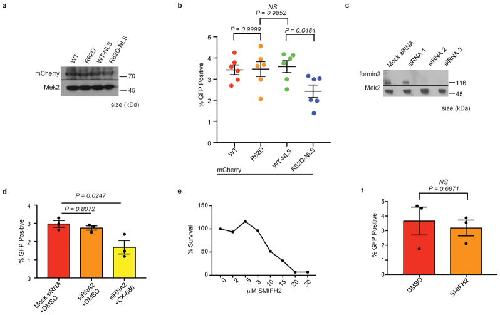 Extended Data Fig. 8. Actin nucleation regulates HDR in the nucleus and does not require formin-2 activitya, Western blot shows expression of mCherry-tagged actin constructs in U2OS whole cell lysates (single experiment). b, Summary of DR-GFP (HDR) assay (P calculated by one-way ANOVA with multiple comparisons; data shown as mean and s.e.m; n=6 independent experiments). c, Western blot shows knockdown of formin-2 following 48 hr transfection of mock or sequence-specific siRNA oligos (single experiment). Formin-2 siRNA #2: 5′-CGUGUAAUCAGAAUGCCCA-3′. d, Summary of DR-GFP assay (P calculated by one-way ANOVA with multiple comparisons; data shown as mean and s.e.m; n=3 independent experiments). e, Mean cell survival after 48 hours of increasing concentrations of the formin inhibitor, SMIFH2 (n=3 independent experiments). f, Summary of DR-GFP assay (P calculated by student’s two-tailed t-test; data shown as mean and s.e.m; n=3 independent experiments). |