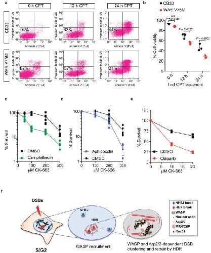 Extended Data Fig. 10. Arp2/3 inactivation confers sensitivity to DSBs induced in S-phase as well as replication stress-inducing agentsa, Control CB33 lymphocytes or lymphocytes bearing a V75M mutation in the WAS gene were treated with camptothecin (CPT) for 0, 12, or 24 hours. Percent viability following CPT treatment was assessed by measuring the fraction of Annexin V and propidium iodide negative cells by flow cytometry. b, Summary of CB33 or WAS V75M lymphocyte survival following CPT treatment (P calculated by two-way ANOVA with multiple comparisons; data shown as mean and s.d.; n=3 independent experiments) c, Clonogenic U2OS cell survival after 12 hr of camptothecin treatment in the presence of DMSO or increasing concentrations of CK-666. (Triplicate experiments; data shown as mean and s.d.; n=2 independent experiments). d, Clonogenic U2OS cell survival after 12 hr of aphidicolin treatment in the presence of DMSO or increasing concentrations of CK-666. (Triplicate experiments; data shown as mean and s.d.; n=2 independent experiments). e, Clonogenic U2OS cell survival after olaparib treatment in the presence of DMSO or increasing concentrations of CK-666 for 14 days. (Triplicate experiments; data shown as mean and s.e.m.; n=2 independent experiments). f, DNA damage induces DSBs, which are repaired preferentially by NHEJ in mammalian cells (in blue). In S/G2, DSBs may be repaired by HDR (in red). All DSBs recruit WASP, but Arp2/3-dependent actin polymerization occurs only at HDR breaks, which become more mobile. Actin polymerization in the vicinity of DSBs generates forces resulting in DSB clustering, optimal DNA end resection, Rad51 foci formation, and HDR. |