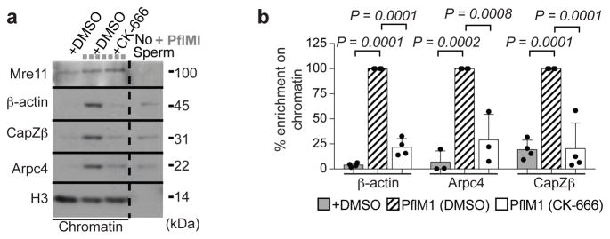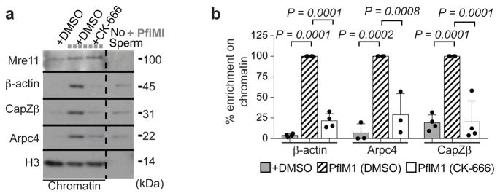 Figure 1. Actin complexes are recruited to damaged chromatina, Enrichment of actin complexes in damaged chromatin (+PflMI) by Western blot. Mre11 indicates DNA damage. b, Protein quantification in chromatin relative to +PflMI samples. (P calculated by one-way ANOVA with multiple comparisons; data shown as mean and s.d.; n=5, 3, and 4 independent experiments, left to right). |