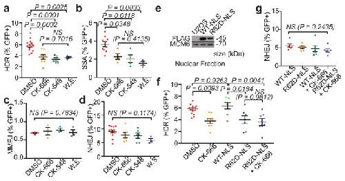 Figure 5. WASP and Arp2/3 mediate HDRa, Summary of DR-GFP (HDR) assay (n=10, 6, 4, 4 left to right). ns, not significant. b, Summary of SA-GFP (SSA) assay (n=7, 4, 4, 3 left to right). c, Summary of EJ2-GFP (MMEJ) assay (n=4, 3, 3, 3, left to right). d, Summary of EJ5-GFP (NHEJ) assay (n=14, 6, 6, 3, left to right). e, Western blot shows FLAG-WT-NLS or FLAG-R62D-NLS overexpression in U2OS nuclear soluble fraction (single experiment). f, DR-GFP assay in cells transfected with FLAG-WT-NLS or FLAG-R62D-NLS. (n=7, 7, 7, left to right). HDR efficiency in the presence of DMSO or CK-666 (Fig. 5a) shown for comparison. g, EJ5-GFP assay in cells transfected with FLAG-WT-NLS or FLAG-R62D-NLS. (n=6, 6, 6, left to right). For 5a–g, P calculated by one-way ANOVA with multiple comparisons as indicated; data shown as mean and s.e.m. n represents independent experiments. |