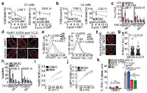 Figure 6. Arp2/3 facilitates resection and repair in G2a, DSB repair at DSBs V-VI in G1-synchronized, ER-AsiSI-AID U2OS cells. Mean and s.d. (n=3 technical replicates) of a representative experiment shown. b, DSB repair at DSBs V-VI in G2-synchronized ER-AsiSI-AID U2OS cells. Mean and s.d. (n=3 technical replicates) of a representative experiment shown. c, Enrichment of single-stranded DNA (ssDNA) at DSBs V–VI following CK-548 treatment. (Data shown as mean and s.d., n=6 replicates from 2 independent experiments). d, Representative images of U2OS nuclei showing Rad51 foci. e, Quantification of Rad51 foci (P calculated by one-way ANOVA with multiple comparisons; smoothed traces show distribution of Rad51 foci. Arrow above respective curves indicates mean number of foci per cell; DMSO: 2 hours n=1830 cells, 8 hours n=2440 cells, 24 hours n=782 cells, CK-666: 2 hours n=2438 cells, 8 hours n=2189 cells, 24 hours n=912 cells). f, Representative images of Arpc2-LoxP-CreER MTF nuclei showing Rad51 foci. g, Quantification of Rad51 foci in MTFs (P calculated by two-tailed Mann-Whitney test; data shown as mean; n=571 nuclei (DMSO), 462 nuclei (4-OHT). h, Representative ssDNA enrichment at DSBs V–VI following mirin treatment. (Data shown as mean and s.d.; n=3 replicates of 2 independent experiments). ssDNA in DMSO-treated cells (Fig. 5c) shown for comparison. i, MSD of Rad52-mCherry foci (Data shown as mean and weighted s.e.m.; DMSO n=3292 foci from 12 cells, Mirin n=2677 foci from 11 cells). j, MSD of 53BP1-YFP foci in G1 cells (Data shown as mean and weighted s.e.m.; DMSO n=893 foci from 12 cells, Mirin n=744 foci from 14 cells). k, Quantification of chromatin-bound RPA in S-phase cells (P calculated by two-way ANOVA with multiple comparisons; data shown as mean and s.e.m.; n=4 independent experiments). |