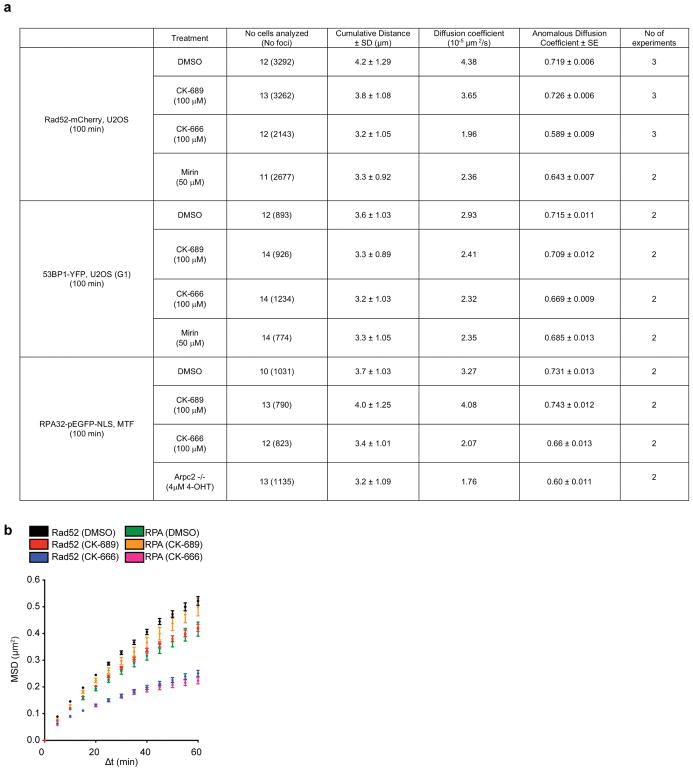 Extended Data Fig. 2. CK-689 does not significantly impact foci movementa, Summary of DSB movement analyses as related to Figures 3, 6, and Extended Data Figure 5. b, MSD of Rad52-mCherry foci and RPA-pEGFP-NLS foci treated with DMSO, CK-689 and CK-666. (Data shown as mean and weighted s.e.m.; Rad52: CK-689 n=3262 foci from 13 nuclei, CK-666 n=2143 foci from 12 nuclei, DMSO n=3292 foci from 12 nuclei. RPA32: CK-689 n=790 foci from 13 nuclei, CK-666 n=823 foci from 12 nuclei, DMSO n=1031 foci from 10 nuclei). MSD of Rad52 DMSO also shown in Fig. 6i. MSD of Rad52 CK-689 and CK-666 also shown in Fig. 3g. MSD of RPA CK-689 and CK-666 also shown in Fig. 3l. |