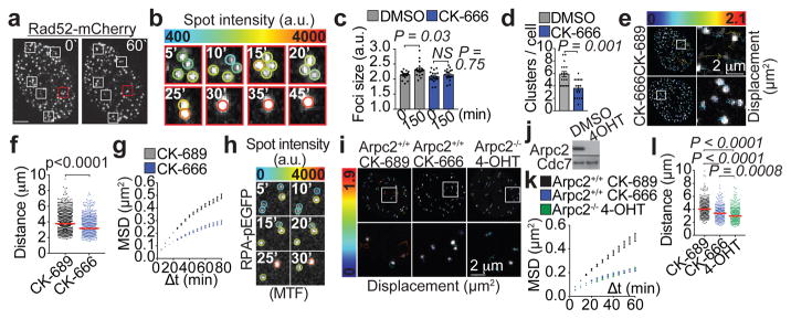Figure 3. Arp2/3 drives DSB mobility during HDRa, A representative U2OS nucleus with boxes indicating Rad52-mCherry foci clustering events. b, Expanded images of clustering from a, red box. Circles denote foci intensity. c, Rad52 foci size (P calculated by one-way ANOVA with multiple comparisons; data shown as mean and s.e.m.; n=19 (DMSO), 17 nuclei (CK-666). d, Rad52-mCherry clustering events (P calculated by two-tailed Mann-Whitney test; data shown as mean and s.e.m.; n=17 (DMSO), 16 nuclei (CK-666). e, Rad52-mCherry foci traces over 100 min. Expanded images of boxed tracks (right). f, Median cumulative distance traveled by Rad52-mCherry foci. P calculated by two-tailed Mann-Whitney test; n=1120 foci from 13 nuclei (CK-689), 720 foci from 12 nuclei (CK-666). g, Mean square displacement (MSD) of Rad52-mCherry foci. Data shown as mean and weighted s.e.m.; n=3262 foci from 13 nuclei (CK-689), 2143 foci from 12 nuclei (CK-666). Δt=time interval. h, pEGFP-RPA32-NLS foci clustering in MTFs. i, RPA32-pEGFP-NLS foci traces over 100 min. j, Arpc2 protein levels in whole-cell lysates from Arpc2-LoxP-CreER MTFs (single experiment). k, Median cumulative distance traveled by RPA32-pEGFP-NLS foci. P calculated by one-way ANOVA with multiple comparisons; n=381 foci from 13 nuclei (CK-689), 370 foci from 12 nuclei (CK-666), 425 from 13 nuclei (4-OHT). l, RPA32-pEGFP-NLS foci MSD (Data shown as mean and weighted s.e.m.; n=790 foci from 13 nuclei (CK-689), 823 foci from 12 nuclei (CK-666), 1135 foci from 13 nuclei (4-OHT). Scale bar is 5 μm or as indicated. |