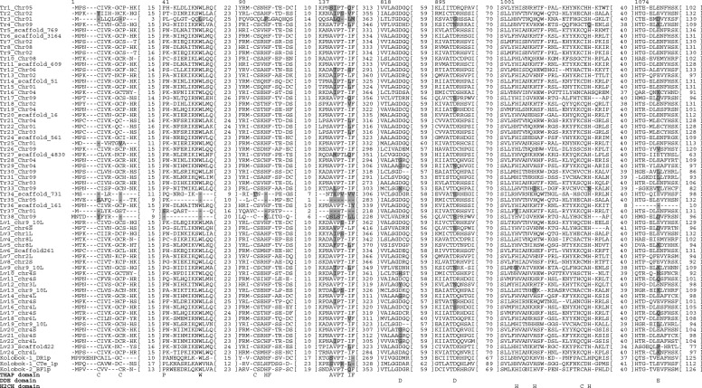 Fig. 1. Conserved regions of prospective XKol transposase CDSs. Conserved regions in a multiple alignment of prospective transposases predicted from the putative CDSs of XKol-Tpase genes with three outgroup transposases (Danio rerio Kolobok-1_DR, Capitella teleta Kolobok-1_CTe, and Branchiostoma floridae Kolobok-2_BF). Numbers above the alignment indicate the position of the amino acids in it (Additional file 1: Figure S1). Numbers in square brackets are the abbreviated amino acids. Consensus residues of conserved domains (DDE, THAP, and H2CH) are shown below the alignment. Nonconserved amino acid residues in conserved motifs are marked by gray shading