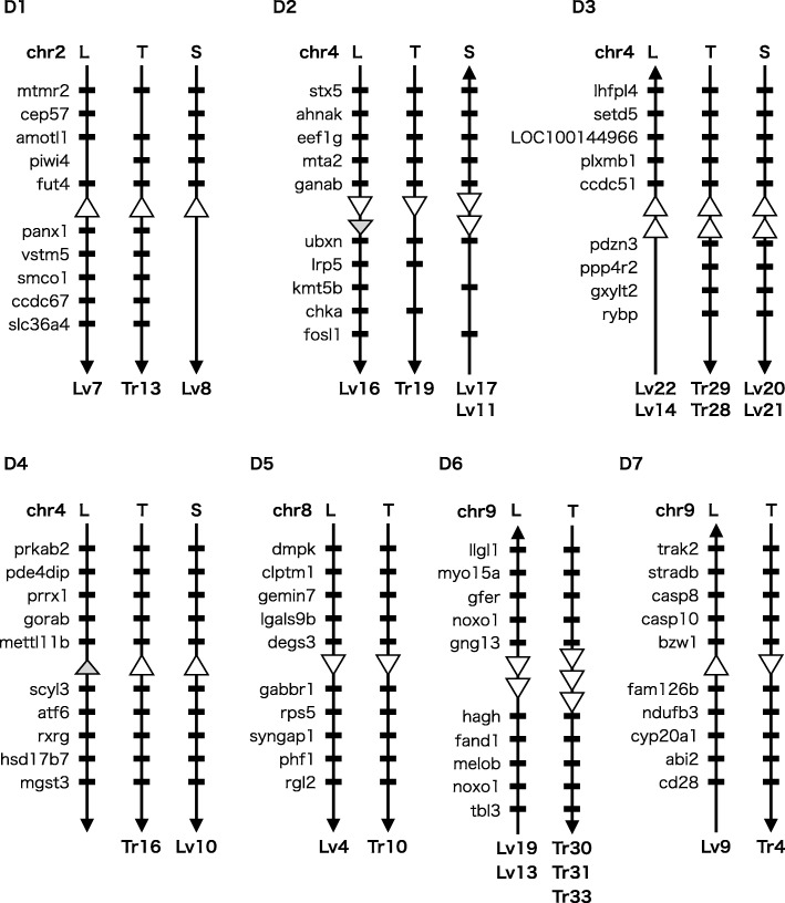 Fig. 4. Synteny of XKol-Tpase genes. Conserved synteny around putative domesticated orthologs of subfamily D1–D7. Xenopus laevis homeologous chromosomes L and S and Xenopus tropicalis homologous chromosome (T) are indicated by arrows. The orientation of each arrow indicates the 5′ to 3′ direction. XKol-Tpase CDSs are represented by white triangles on the chromosomes, and their names are shown below the chromosomes. Gray triangles indicate truncated XKol-Tpase sequences. Gene models around the CDSs are represented by black bars