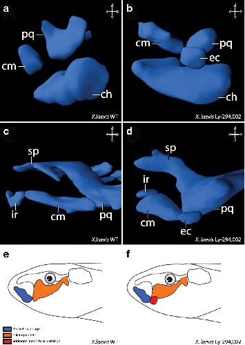 3D reconstructions based on confocal laser scanning microscopy showing the effects of Ly-294,002 treatment on cranial cartilage morphology in Xenopus laevis larvae. Lateral view of ZO 10 (a, b) and ZO 17 (c, d) larvae with normal bapx1 expression (left column) and elevated bapx1 expression (right column). In Ly-294,002-treated specimen with increased bapx1 expression an ectopic cartilage develops within the mandibular arch lateral to the palatoquadrate. Depictions of X. laevis larvae in lateral view show the main differences between e normal and f perturbed development. In short, the processus muscularis is reduced in size and an ectopic cartilage arises lateral to the palatoquadrate after upregulation of bapx1. ch, ceratohyal; cm, Meckel’s cartilage; ec, ectopic cartilage; ir, infrarostral cartilage; pq, palatoquadrate; sp., suprarostral plate |