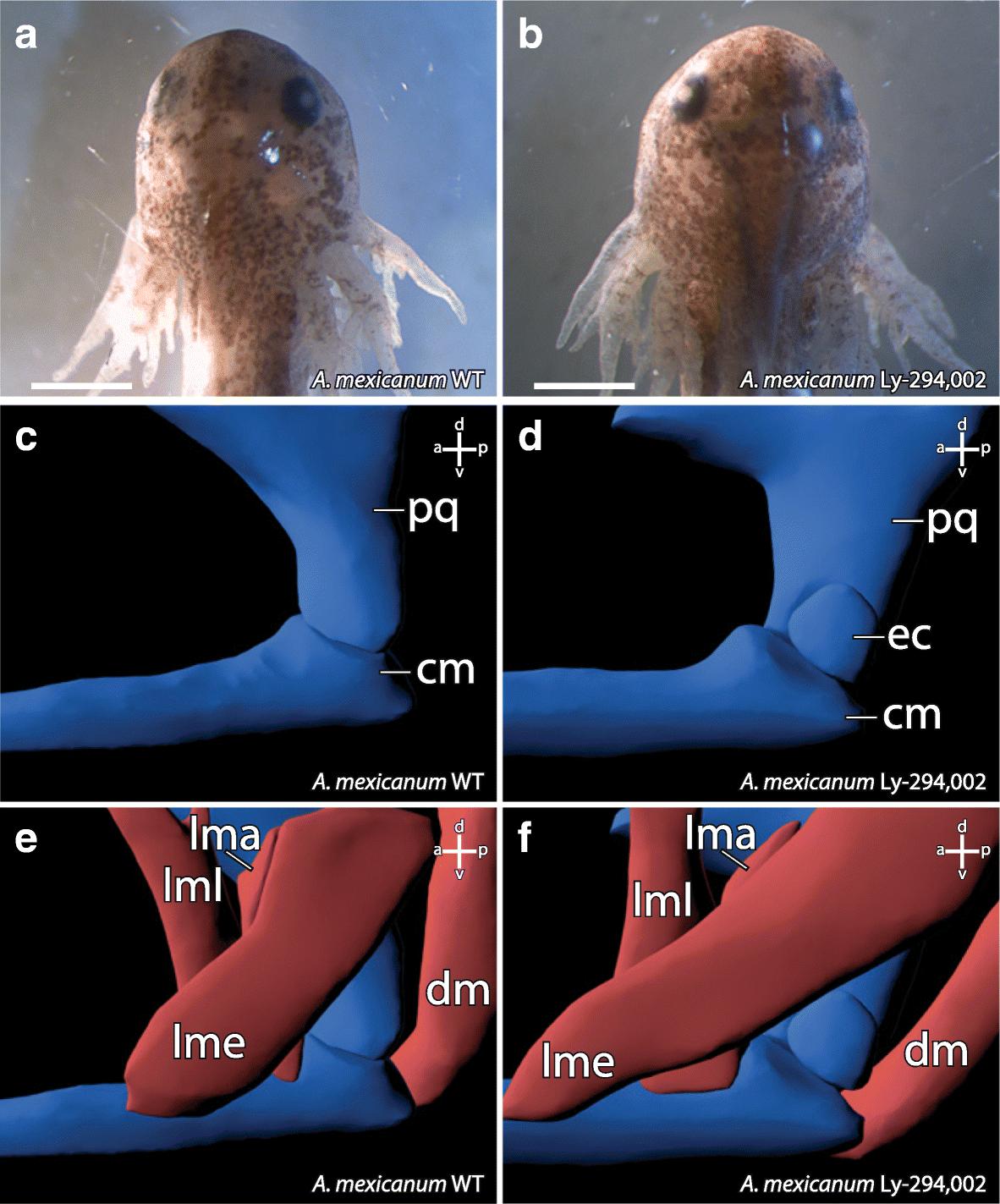 Effect of Ly-294,002 treatment on the external and internal morphology of A. mexicanum. Dorsal view of a control and b Ly-294,002 treated specimens reveals no differences in external morphology. Lateral view of 3D-reconstructions based on confocal laser scanning microscopy of c control and d Ly-294,002 treated specimen shows the development of an ectopic cartilage lateral to the jaw articulation in treated specimens. The musculature of e control and f treated specimens are similar and no changes in origination or insertion of muscles can be observed after bapx1 upregulation. cm, Meckel’s cartilage; dm, M. depressor mandibulae; ec, ectopic cartilage; lma, M. levator mandibulae articularis; lme, M. levator mandibulae externus; lml, M. levator mandibulae longus; pq, palatoquadrate. Scale bar 500 μm |