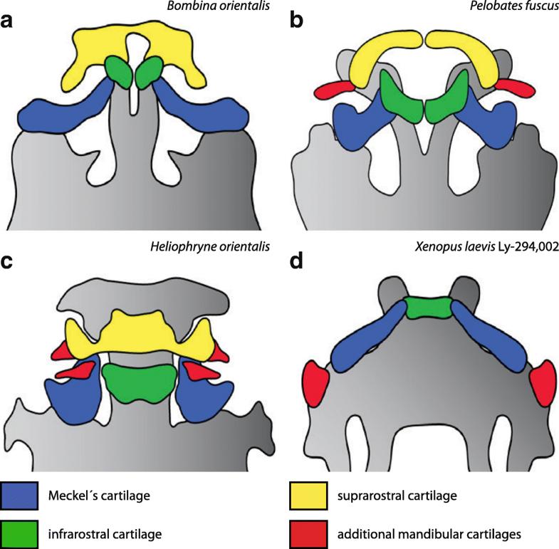 Overview of the diversity of adrostral cartilages among anurans. Ventral view of the jaw region of selected anuran larvae. a Bombina orientalis shows a typical anuran condition of the jaw region consisting of paired infrarostral cartilages, a plate-like suprarostral cartilage and horizontally oriented Meckel’s cartilages. b In Pelobates fuscus (drawn after Nikitin 1986) two so-called adrostral cartilages can be observed lateral to the paired suprarostral cartilages. c Heliophryne orientalis possesses two additional cartilages in the lower jaw. The submeckelian cartilages lie beneath Meckel’s cartilages and the adrostral cartilages are situated lateral to the suprarostral cartilage. In Ly-294,002-treated Xenopus laevis larvae (d) the ectopic cartilages arise lateral to the palatoquadrate and are free from any muscle insertion or origination similar to P. fuscus and H. orientalis |