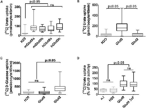 FIGURE 1. Glut9-mediated [14C] urate uptake in Xenopus laevis oocytes. (A) [14C] urate uptake was measured after 45 min incubation time in X. laevis oocytes injected with human or mouse Glut9a, Glut9b or with water (H2O). Total concentration of urate in the uptake solution is 400 μM. (B,C) Glut9 transports [14C] urate, but not [14C] D-Glucose. (D) The introduction of a triple flagged tag (Glut9 3xF) did not affect urate transport by Glut9. Statistical analysis were performed using a KruskalâWallis test followed by a correction with Dunnettâs test (p < 0.05). Each bar represents the mean and standard deviation of 3 independent batches of oocytes, with 10 oocytes per batch and condition. N.i, not injected; NS, not significant. |