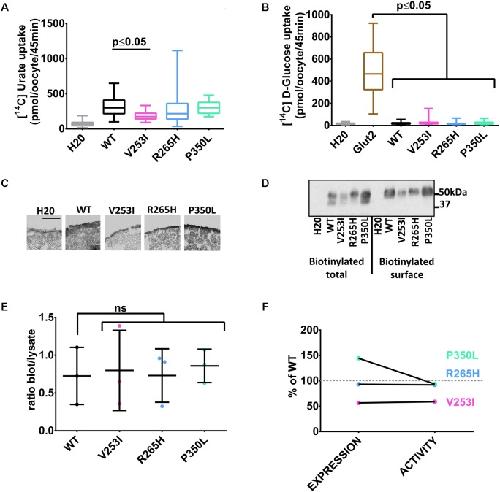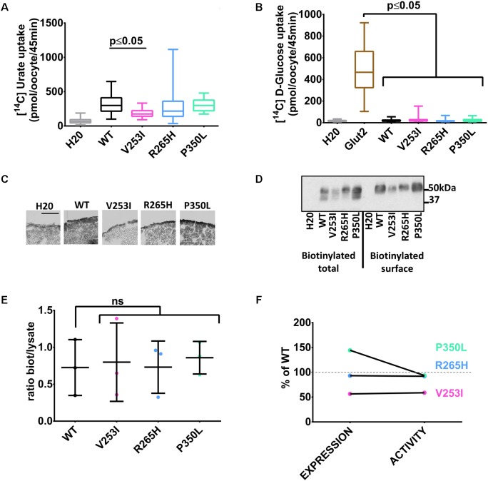 FIGURE 3. Transport studies on Glut9 SNPs associated with low SUA. [14C]urate (A) and [14C]glucose (B) uptake in oocytes injected with Glut9 SNPs. (C) Immunohistochemistry with an anti-Flag antibody of cryosections of oocytes injected with WT-Glut9 and SNPs V253I, R265H, and P350L reveals a decreased expression at the cell surface for V253I. Protein expression was also verified by biotinylation and densitometric analysis (D,E). (F) Comparison of expression level and activity of WT-Glut9 or SNPs. Statistical analysis was performed using a KruskalâWallis test followed by a correction with Dunnettâs test (p < 0.05) with 3 batches of oocytes with 10 oocytes per batch and per condition for the fluxes and 20 oocytes for biotinylation. |