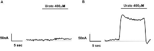 FIGURE 4. Electrogenicity of human Glut9 upon urate exposure. Representative trace current of H2O-(A) or Glut9-(B) injected oocytes in presence of 400 μM urate. The dashed line represents the current at baseline (0 mV). |