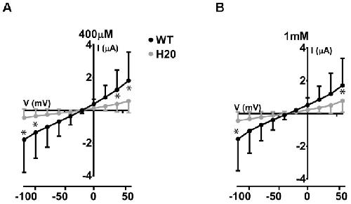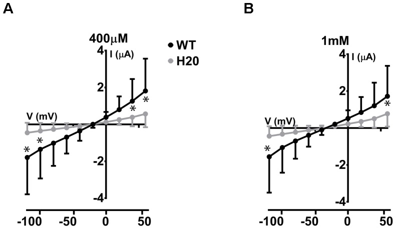 FIGURE 5. Electrophysiological studies of WT-Glut9. I/V curves for H2O-injected and WT-Glut9-injected oocytes exposed to 400 μM (A) or 1 mM (B) of urate. Three batches of oocytes were used with 5 oocytes per batch. Data are means ±SD. Asterisks denote p < 0.05 between Glut9- and H2O-injected oocytes. |