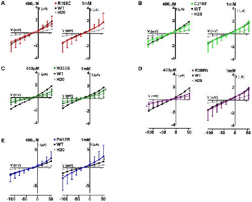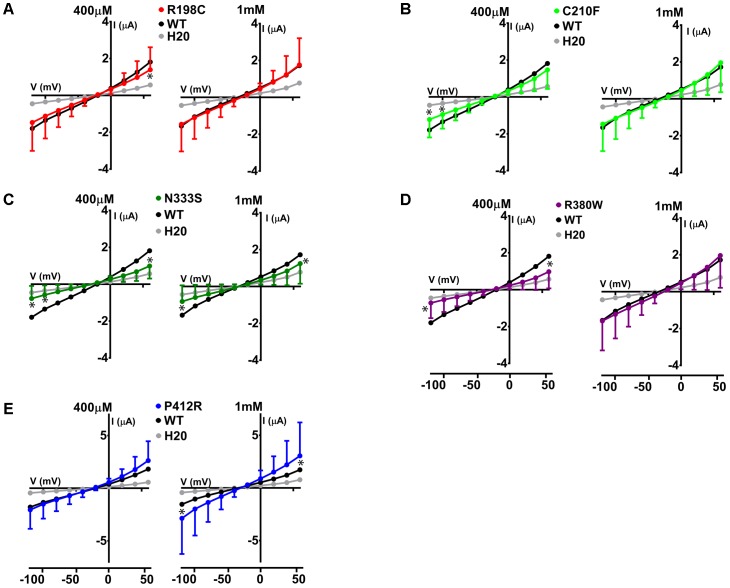 FIGURE 6. Electrophysiological studies of mutants Glut9. I/V curves for the following Glut9 mutants measured at 400 μM and 1 mM urate were built: R198C (A), C210F (B), N333S (C), R380W (D), and P412R (E). For the ease of comparison, the I/V curves for Glut9-WT and for water-injected-oocytes are represented on each panel. Three batches of oocytes were used with 5 oocytes per batch. Asterisks denote p < 0.05 by unpaired t-test between WT-injected and mutant-injected oocytes. |
