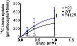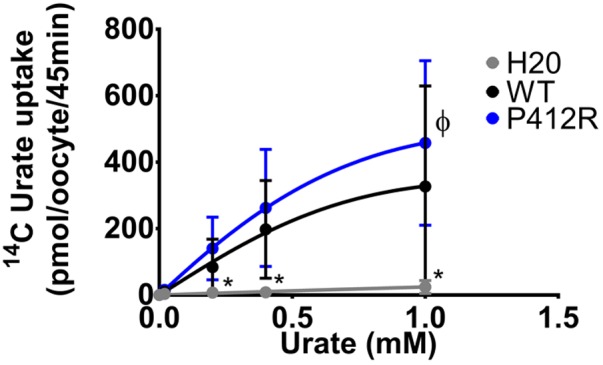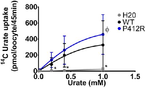 FIGURE 7. Concentration-response analysis for P412R. [14C]urate uptake was measured in H2O, WT, or P412R-injected oocytes at increasing concentrations of urate: 0.02, 0.20, 0.40, and 1 mM. Ten oocytes per batch on 3 batches of oocytes were used. A Dunnett’s multiple comparison test was used to compare P412R to WT and water (∗p < 0.05). |