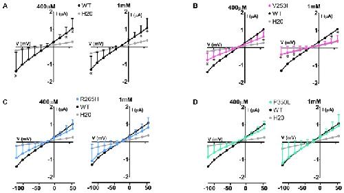 FIGURE 8. Electrophysiological studies of Glut9 SNPs. I/V curves built upon exposure to 400 μM or 1 mM of urate for: Glut9 WT and water-injected oocytes (A) or Glut9 SNPs injected-oocytes: V253I (B), R265H (C), and P350L (D). For the ease of comparison, the I/V curves for Glut9-WT and for water-injected-oocytes are represented on each panel. Three different batches of oocytes were used with 5 oocytes per batch. âRepresents p < 0.05 compared to WT-injected oocytes. |
