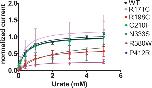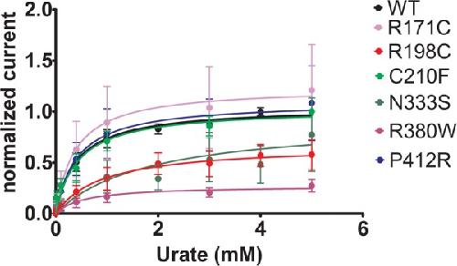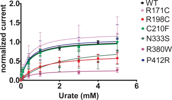 FIGURE 9. Urate kinetics of WT-Glut9. Glut9-injected oocytes were sequentially exposed to increasing urate concentrations (0.01, 0.1, 0.4, 1, 3, and 5 mM) and current was recorded by TEVC, clamped at 0 mV. Each measurement was repeated on atleast 5 oocytes per batch on atleast 3 batches. Detail analysis of Vmax and Km are reported in Table 3. |