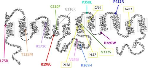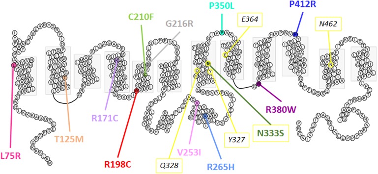 FIGURE 10. Predicted secondary structure of Glut9. Representation of human Glut9 mutations and SNPs associated with variations of serum uric acid. Transmembrane domains are indicated by gray boxes. Extracellular side is upper and intracellular side is lower. The corresponding five main residues involved in glucose binding in hGLUT1 have been highlighted in yellow as indication. |