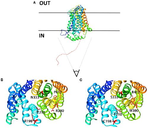 FIGURE 11. 3D homology model for Glut9, based on human Glut1 crystal structure. (A) Lateral view of Glut9-WT. (B,C) Represent views from the cytoplasmic side into the direction of the putative pore of the transporter. The different helices are illustrated and the residues involved in human familial hypouricemia are illustrated in red, as WT amino acids on (B) and as mutated amino acids on (C). |
