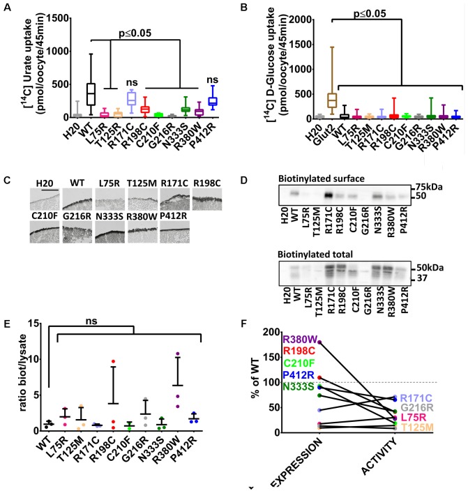 FIGURE 2. Transport studies on human Glut9 loss-of-function mutations. (A) [14C] urate uptake assay was systematically performed on published Glut9 loss-of-function mutants and revealed decreased activity for all of them (i.e., L75R, T125R, R198C, C210F, G216R, N333S, and R380W) except for mutants R171C and P412R that do not reach significance. (B) None of these mutants displayed D-glucose transport activity when tested for [14C] D-glucose uptake. (C) Immunohistochemistry with an anti-Flag antibody on cryosections of oocytes injected with WT-Glut9 or mutant showed conserved expression at the cell surface for R171C, R198C, C210F, N333S, R380W, P412R and a decreased cell surface expression for L75R, T125M, and G216R. Representative pictures of three experiments from different oocyte batches are shown. (D) Cell surface assessment by biotinylation assay on oocytes injected either with Glut9 WT or the designated Glut9 mutants. One representative experiment out of 4 is shown. (E) Densitometric analysis revealed no difference in the ratio between biotinylation and total lysates for each Glut9 mutant when compared to WT Glut9. (F) Summary of cell surface expression (biotinylation) and transport activity (urate uptake) of all tested mutants reported to Glut9 WT. R198C, C210F, N333S, R380W, and P412R (in black) are the Glut9 mutants displaying preserved cell surface expression but decreased transport activity. L75R T125M, R171C, and G216R (in gray) are less expressed than WT and except for R171C, have less activity. Statistical analysis was performed using a KruskalâWallis test followed by a correction with Dunnettâs test (p < 0.05). Each experiment was performed on 3 independent batches of oocytes with 10 oocytes per batch and condition for uptake assay and 20 oocytes per condition for the biotinylation assay. |