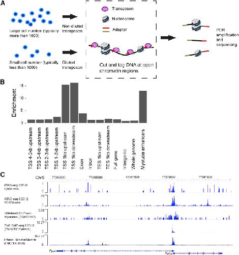 Figure 1. ATAC-Seq Enables the Identification of Open Chromatin Regions(A) The modified ATAC-seq protocol for our experiments.(B) The genomic distribution of ATAC-seq peaks in C2C12 mouse myoblasts, representing open chromatin. The y axis represents the enrichment of peaks in each type of genomic region relative to the whole genome. Two independently prepared ATAC-seq libraries were used for the analysis.(C) A track image of ATAC-seq from 1,000 and 50,000 cells, chromatin immunoprecipitation sequencing (ChIP-seq) of H3K4me3 (GSM72193) and RNA polymerase II (GSM915176), and DNase-seq (GSM1014189) at the Ppat and Paics genes in mouse muscle cells. Open chromatin at the TSS is adjacent to H3K4me3 marks.