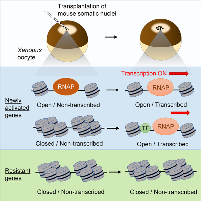 Oocytes have a remarkable ability to reactivate silenced genes in somatic cells. However, it is not clear how the chromatin architecture of somatic cells affects this transcriptional reprogramming. Here, we investigated the relationship between the chromatin opening and transcriptional activation. We reveal changes in chromatin accessibility and their relevance to transcriptional reprogramming after transplantation of somatic nuclei into Xenopus oocytes. Genes that are silenced, but have pre-existing open transcription start sites in donor cells, are prone to be activated after nuclear transfer, suggesting that the chromatin signature of somatic nuclei influences transcriptional reprogramming. There are also activated genes associated with new open chromatin sites, and transcription factors in oocytes play an important role in transcriptional reprogramming from such genes. Finally, we show that genes resistant to reprogramming are associated with closed chromatin configurations. We conclude that chromatin accessibility is a central factor for successful transcriptional reprogramming in oocytes.