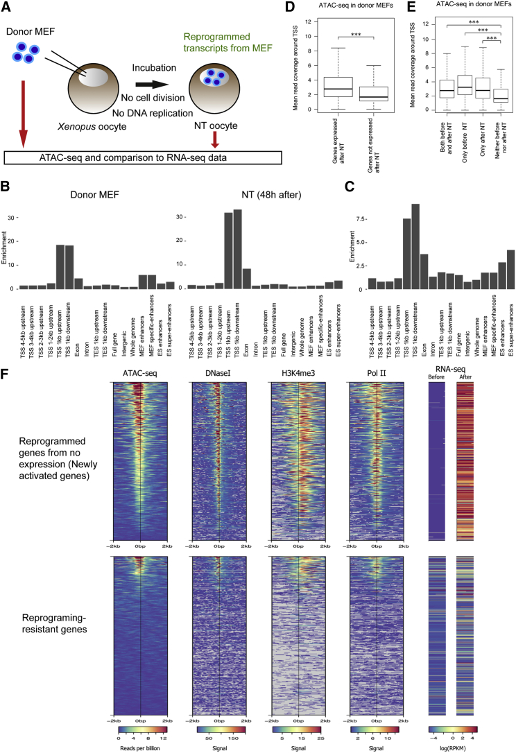 Figure 2. Genes with Open TSSs Are Preferentially Reprogrammed upon NT to Xenopus laevis Oocytes(A) MEFs are transplanted into the nuclei of Xenopus oocytes, reprogramming their transcription. MEFs before NT and reprogrammed MEFs were used for ATAC-seq. Two biologically independent NT experiments were performed for the subsequent analyses (10 NT oocytes, equivalent to 3,000 cells, were pooled in each experiment).(B) The genomic distribution of ATAC-seq peaks representing open chromatin before and after NT. The y axis represents the enrichment of peaks in each type of genomic region relative to the whole genome.(C) The genomic distribution of newly appeared ATAC-seq peaks after NT.(D) ATAC-seq reads in donor MEFs were compared around TSSs. Genes were divided into two categories: expressed in NT oocytes and not expressed in NT oocytes. The y axis represents the mean read coverage in a 1-kb window centered on the TSS.(E) ATAC-seq reads around TSSs in donor MEFs were compared among different gene categories: genes expressed before and after NT, those expressed only before NT, those expressed only after NT, and those expressed at neither time point.(F) Representation of signal associated with open chromatin (ATAC-seq, DNase-seq, H3K4me3 ChIP-seq, and Pol II ChIP-seq) at TSSs of MEF genes reprogrammed in Xenopus oocytes. RNA-seq results (Jullien et al., 2014, Jullien et al., 2017) are shown at the right panel. Accession numbers for the DNase-seq, H3K4me3, and Pol II data are GSM1014172, GSM769029, and GSM918761, respectively.âââp < 1Eâ6 by the Mann-Whitney U test.