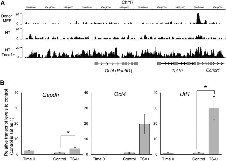 Figure 4. Efficient Transcriptional Reprogramming Is Associated with Increased Chromatin Accessibility(A) ATAC-seq reads for donor MEFs, control NT oocytes, and NT oocytes overexpressed with Toca1/Fnbp1l around the Oct4 gene locus.(B) TSA treatment enhances transcriptional reprogramming. NT oocytes incubated with or without 50 nM TSA for 24 hr were used for qRT-PCR. Time 0 represents NT oocytes just after NT. n = 3 (time 0) or 4 (control and dnRAR). Error bars represent ± SEM. âp < 0.05 by the Studentâs t test.