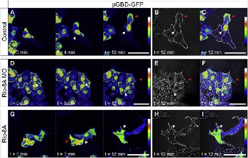 Fig. 5. Changes in Ric-8A expression affect the localization of active RhoA. Representative time-lapse images of migrating CNC cells expressing the rGBD-mCherry probe for detection of RhoA activity in Ric-8A loss- or gain-of-function. The images were taken at the indicated time on each panel. (A) Control cells with active RhoA localized at cell-cell contacts at 0, 5 and 7â¯min. The same cells in A at 7â¯min are shown in transmitted light (B) and merged with RhoA activity (C). (D) Cells under Ric-8A loss-of-function show RhoA activity localized in the protrusions at the leading edge at 0, 5 and 9â¯min. The same cells in (D) taken at 9â¯min are shown in transmitted light (E) and merged with RhoA activity (F). (G) Cells under Ric-8A gain-of-function show active RhoA localized in cell protrusions at the leading edge at 0, 10 and 13â¯min. The same cells in (G) at 13â¯min are shown in transmitted light (H) and merged with RhoA activity (I). White and red arrowheads show changes in RhoA activity on the protrusions at the leading edge and cell-cell contacts, respectively. The limits of the cells were marked with stitched lines in the transmitted light panels in order to visualize cell-cell contacts in greater detail. Scale bar, 40â¯Î¼m. Movies from migrating cells can be found in the Supplementary data movie 3. The images and movies are representative of five independent experiments analyzing 3â4 explants per each condition.