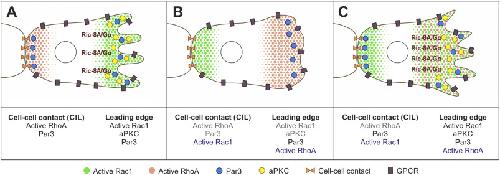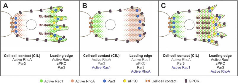Fig. 6. Ric-8A regulates CNC cell polarization through the Gα subunit. Ric-8A through it GEF and chaperone function over Gα subunit translocates the aPKC and Par3 proteins to the cell cortex controlling downstream active GTPases localization. (A) Control cells maintain active Rac1 and aPKC at the leading edge and maintain Par3 and active RhoA at cell-cell contacts. (B) Cells with Ric-8A loss-of-function show loss of Par3 and aPKC localization, and a shift of Rac1 activation to cell-cell contacts and RhoA to the leading edge. (C) Cells with Ric-8A gain-of-function show recovery of Par3 localization. At the leading edge, both Rac1 and RhoA remain active, while active Rac1 is also present at cell-cell contacts.
