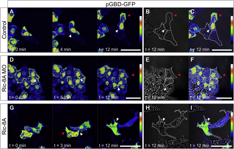 Fig. 3. Changes in Ric-8A expression levels affect active Rac1 localization. Representative images from movies of migrating CNC cells expressing the pGBD-GFP probe for detection of Rac1 activity in Ric-8A loss- or gain-of-function conditions. Images were taken the indicated time on each panel. (A) Control cells show active Rac1 localized at cell protrusions in the leading edge and not at cell-cell contacts (taken at timeâ¯=â¯0, 4 and 12â¯min). The same cells in A taken at 12â¯min are shown in transmitted light (B) and merged with Rac1 activity (C). (D) CNC cells from Ric-8A loss-of-function conditions show that Rac1 activity is localized at cell-cell contacts at 0, 5 and 12â¯min as well as at the leading edge. The same cells in (D) at 12â¯min are shown in transmitted light (E) and merged with Rac1 activity (F). (G) CNC cells under Ric-8A gain-of-function conditions show active Rac1 localized at cell protrusions in the leading edge at 0, 3 and 12â¯min, and this activity seems to be higher and distributed around the whole cell. The same cells in (G) taken at 12â¯min are shown in transmitted light (H) and merged with Rac1 activity (I). White and red arrowheads show changes in Rac1 activity in the protrusions and cell-cell contacts, respectively. In the transmitted light panels, the limits of the cells were marked with stitched lines in order to visualize cell-cell contacts in greater detail. Scale bar, 40â¯Î¼m. Movies from migrating cells can be found in the Supplementary data movie 1. The images and movies are representative of five independent experiments analyzing 3â4 explants per each condition.