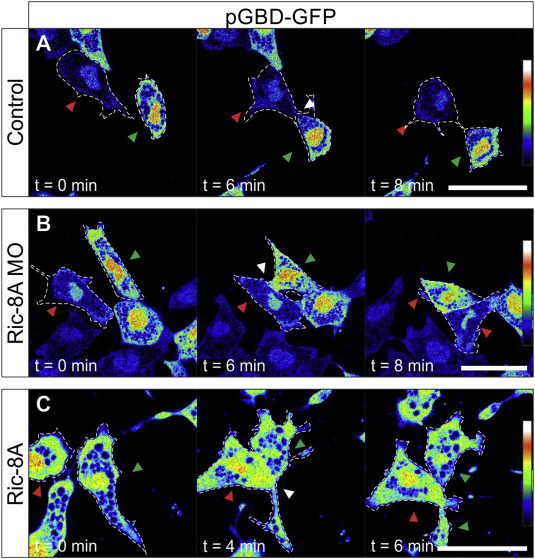 Fig. 4. Ric-8A loss- and gain-of-function affects Rac1-mediated cell invasion. Representative images from movies of migrating CNC cells expressing the pGBD-GFP probe for detection of Rac1 activity in Ric-8A loss- and gain-of-function conditions. The images were taken at the indicated times on each panel. (A) Time-lapse images of two control cells that collide and change their direction of migration at 6â¯min show a loss in Rac1 activity when the cells touch each other with active Rac1 emerging at the opposite side. (B) Cells with Ric-8A loss-of-function overlap when they collide and maintain Rac1 activity at cell-cell contacts. (C) Cells with Ric-8A gain-of-function also overlap when they collide. On each panel, red and green arrowheads track two colliding cells, and white arrowheads show the zone of collision. The limits of the cells were marked with stitched lines in order to visualize cell-cell contacts in greater detail. Scale bar, 40â¯Î¼m. Movies from migrating cells can be found in the Supplementary data movie 2. The images and movies are representative of five independent experiments analyzing 3â4 explants per each condition.
