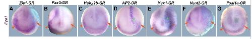 Figure S2. Cell autonomous requirements of Zic1 and Pax3 for PPE formation. Neural plates were orthotopically grafted from donor embryos to host embryos. A: Control grafts from GFP injected embryos into uninjected hosts. There is no effect on Six1 expression in the PPE (except for a slight decrease in 1/4 embryos). B: Grafting a neural plate from Pax3 MO injected embryo into uninjected hosts does not affect Six1 expression in the PPE (except for 1/10 cases). C: A neural plate graft from an uninjected embryo is unable to rescue deficits in Six1 expression in the PPE (arrow) of Pax3 MO injected embryos evident in 2/ 4 embryos. D: Grafting a neural plate from Zic1 MO injected embryo into uninjected hosts does not affect Six1 expression in the PPE (0/5). E: A neural plate graft from an uninjected embryo is unable to rescue deficits in Six1 expression in the PPE (arrow) of Zic1 MO injected embryos evident in 2/5 embryos. Asterisk indicates Six1 expression in graft. Arrowheads indicate the Six1 expression domain in the PPE on the control side. G: graft. (PDF 2727 kb) |