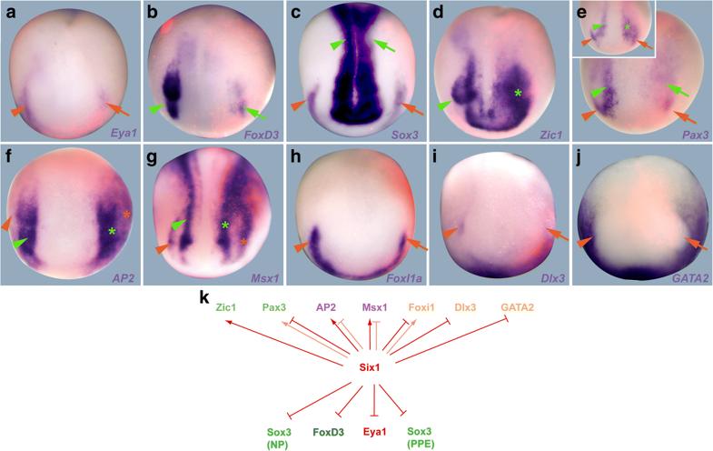 Fig. 5 Effects of Six1 overexpression on NPB markers and other ectodermal TFs. aâj Expression of PPE (Eya1, Sox3), NC (FoxD3), neural plate (Sox3) markers and early ectodermal TFs in dorsal views of neural plate stage Xenopus embryos after injection of Six1 mRNA. Anterior is to the bottom. Control side is shown on the left and injected side on the right (as indicated by red LacZ immunostaining). Arrowheads indicate expression domains on the control side. Reductions (arrows) and increased or ectopic expression domains (asterisks) in the neural (green) and non-neural ectoderm (orange) compared with the control side (arrowheads) are indicated. Insets show alternative phenotypes. k Summary of regulatory interactions. Arrows indicate ability of Six1 to promote expression of TFs. Bars indicate ability of Six1 to repress TFs. Faint colors indicate less frequent phenotypes. See Additional file 1: Table S9 for numbers. |