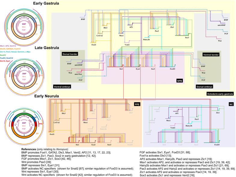 Fig. 6 Gene regulatory network (GRN) for NPB development in Xenopus laevis. Greyed out genes represent those inactive in a particular cell population (e.g. Zic1 in the PPE). All interactions shown are based on functional studies and may be direct or indirect. Solid lines indicate relationships established in the present study or in [15], whereas hatched lines indicate relationships established in previous studies referenced below. Arrows indicate activation. Bars show repression. Thick lines indicate relationships verified in loss of function (and often also in gain of function) experiments, while thin lines indicate relationships only supported by gain of function experiments. Signaling pathways are shown in extra thick lines. Often there is experimental evidence to support both activation and repression of genes by upstream TFs. Further studies are needed to elucidate the interactions determining these context-dependent effects. In the absence of functional data, temporal changes of regulatory relationships are proposed here based on changing expression patterns. Panels on the left depict idealized cross sections through cranial region of Xenopus embryos showing TF distribution at three stages of development (D, dorsal; V, ventral) (modified from [2]). Hatched lines indicate downregulation of expression. Pax3 and c-Myc TFs only get upregulated in the lateral part of the turquoise domain during gastrulation. Presumptive neural plate (NP), neural crest (NC), preplacodal ectoderm (PPE), and epidermis (EP) are shown as fate map for gastrula stages (faint colors) and as specified territories for the early neurula (strong colors). BMP, Wnt, and FGF signaling is shown by colored lines inside the schematized embryo, with graded BMP activity and approximate position of sources of BMP inhibitors and Wnt inhibitors indicated (bars). During gastrulation, many TFs become increasingly dorsally (turquoise and green) or ventrally (orange and pink) restricted, and the region of overlap decreases. NC (blue) and PPE (red) specifiers become confined to non-overlapping territories in the neural (turquoise) and non-neural (orange) ectoderm at the end of gastrulation. See text for details. |