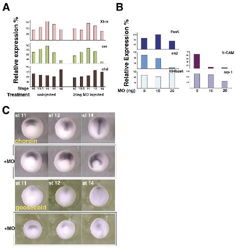 Fig. 2. Organizer genes are expressed but some neural markers are reduced in Xnr3â embryos. (A) Organizer gene expression was analyzed at gastrula and early neurula stages (stage 10, 10.5, 11, 12, 14). Xnr3 MO does not affect the expression level of organizer genes. (B) Neural markers were analyzed at stage 28 NCAM and en2 expression was repressed in MO-injected embryos. 10 ng (for late markers), or 20 ng (for both early and late markers) was injected into the dorsal marginal two cells at the 4-cell stage. In each case, ornithine decarboxylase (ODC) was used as a loading control (data not shown), and expression of each gene was normalized to the level of ODC expression. (C) chd and gsc are not expressed in the correct region in MO-injected embryos. Expression pattern of chd (top two rows), and gsc (bottom two rows) in uninjected (upper row) and MO-injected (lower row) embryos. chd was expressed normally in MO-injected embryos at stage 11, and continued to be expressed around the dorsal rim of the blastopore even at stage 14. Gsc expression in MO-injected embryos also remained adjacent to the blastopore at stage 14. 20 ng of MO was injected into the two dorsal animal cells of stage 8 albino embryos, and the expression pattern was analyzed by whole-mount in situ hybridization.