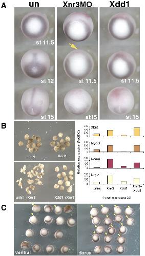 Fig. 3. The expression of Xbra is absent in the dorsal marginal region of MO-injected embryos at the gastrula stage and from the notochord region at the neurula stage. (A) The expression of Xbra in uninjected control (A), Xnr3 MO-injected (B), and Xdd1h mRNA-injected (C) embryos. Dorsal expression of Xbra was reduced at stage 11.5 (arrow) and stage 15 in the MO-injected region in Xnr3â embryos (middle column), whereas it occurred normally at stage 11.5 in Xdd1 mRNA-injected embryos (third column). Xbra expression in Xdd1 mRNA-injected embryos was lost in the neurula stage (stage 15). (B) Xnr3-induced animal cap elongation is blocked by the expression of dominant negative dishevelled mRNA (Xdd1). Xdd1 expression alone does not cause elongation of caps. These samples were frozen and subjected to real-time PCR analysis for the expression of Xbra, MyoD, NCAM and nrp1 (Fig. 3B righthand side). All these markers continue to be induced by Xnr3 in animal caps in the presence of Xdd1. (C) The dorsal reduction of Xbra expression is specific in Xnr3 MO-injected embryos. The expression of Xbra was analyzed in dorsally and ventrally injected embryos. Xbra expression in ventrally injected embryos was slightly delayed at the injected region, but was otherwise normal. Arrowheads indicate areas where Xbra expression is missing from the blastopore ring. 20 ng of MO was injected together with NLS-lacZ RNA into two dorsal or ventral marginal two cells in 8-cell-stage embryos.