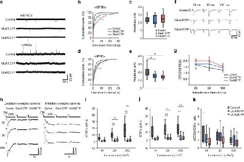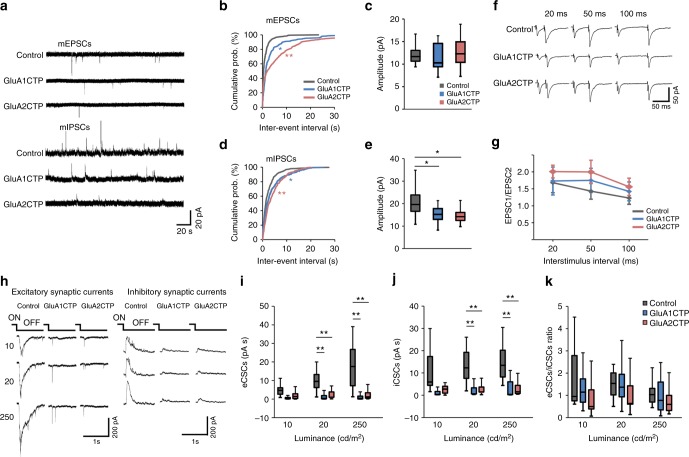 Fig. 1. GluACTP expression reduced both spontaneous and evoked excitatory and inhibitory synaptic transmission in tectal neurons. a Representative traces of mEPSCs and mIPSCs from neurons expressing EGFP only (Control), GluA1CTP, and GluA2CTP, respectively. b Expression of GluA1CTP or GluA2CTP significantly increased inter-event intervals (IEIs) of mEPSCs in tectal neurons. *P < 0.05, **P < 0.01. Kolmogorov–Smirnov test. c Amplitudes of mEPSCs were not significantly affected by GluA1CTP or GluA2CTP expression. Control: n = 14; GluA1CTP: n = 13; GluA2CTP: n = 15. d, e Cumulative distributions (d) and amplitudes (e) of mIPSCs showing GluA1CTP or GluA2CTP expression significantly increased IEI and decreased amplitudes of mIPSCs compared to control neurons. *P < 0.05, **P < 0.01. Kolmogorov–Smirnov test or ANOVA with Newman–Keuls posthoc test. f Representative recordings of EPSCs in response to paired stimuli 20, 50, and 100 ms apart from neurons in each experimental group. Stimulus artifact was clipped for clarity. g Paired pulse ratios of EPSC2/EPSC1 were not significantly different between control, GluA1CTP-, and GluA2CTP-expressing neurons. Scale bar: 20 pA, 20 ms. Control: n = 7; GluA1CTP: n = 5; GluA2CTP: n = 5. h Representative traces for visually evoked excitatory CSCs (eCSCs) and inhibitory CSCs (iCSCs) in control, GluA1CTP-, and GluA2CTP-expressing neurons in response to full-field light off visual stimuli at intensities of 10, 20, and 250 cd cm−2. i, j Summary data showing that eCSCs (i) and iCSCs (j) in GluA1CTP- and GluA2CTP-expressing neurons are significantly decreased compared to control neurons in response to visual stimuli of 20 and 250 cd cm−2 respectively. Control: n = 7; GluA1CTP: n = 7; GluA2CTP: n = 7. k The ratio of eCSCs to iCSCs in GluA1CTP- and GluA2CTP-expressing neurons remained comparable to control neurons in response to visual stimulation of all luminances tested. ANOVA with Newman–Keuls posthoc test. We record tectal neurons blind to neurotransmitter type. Approximately 70% of tectal neurons are excitatory neurons, therefore the electrophysiological results most likely reflect changes in the excitatory neurons. For boxplots in this and following figures, the box represents the 25th and 75th percentiles of the samples. The center line represents the median and whiskers depict the full range of observations |