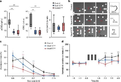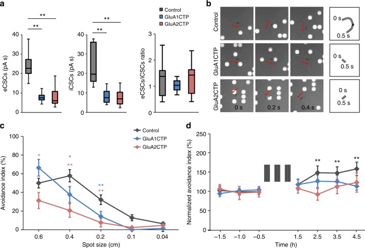 Fig. 8. GluACTP expression impairs visual avoidance behavior and behavioral plasticity. a Expression of GluA1CTP or GluA2CTP with bulk electroporation significantly decreased visually evoked eCSCs and iCSCs in transfected neurons compared to controls. The ratio of eCSCs to iCSCs in GluA1CTP- and GluA2CTP-expressing neurons remained comparable to control neurons. Control: nâ=â7; GluA1CTP: nâ=â8; GluA2CTP: nâ=â7. b Representative snapshots of tadpole behavior in response to upward moving spot stimuli (diameter 0.4âcm) in animals expressing GFP, GluA1CTP, or GluA2CTP in tectal neurons. Top panel: Control tadpoles turned to avoid an approaching stimulus. The swim trajectory over 500âms is shown on the right. Tadpoles in which the optic tectum was electroporated with GluA1CTP (middle panel) or GluA2CTP (bottom panel) did not change swim trajectories in response to a moving stimulus. c Summary data: avoidance index in response to stimuli of diameters 0.04â0.6âcm for animals expressing GFP (control, nâ=â15) or GFP with GluA1CTP (nâ=â21) or GluA2CTP (nâ=â18) in the optic tectum. d GluA1CTP (nâ=â20) or GluA2CTP (nâ=â16) expression blocked visual experience-induced enhancement of visual avoidance behavior observed control tadpoles (nâ=â18). *Pâ<â0.05, **Pâ<â0.01. ANOVA with NewmanâKeuls test. Error bar: meanâ±âs.e.m. |
