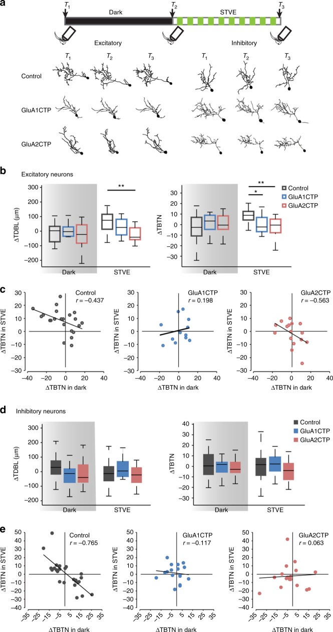 Fig. 4. GluACTP expression disrupts experience-dependent structural plasticity in excitatory and inhibitory neurons. a Representative images of complete dendritic arbor reconstructions from time-lapse images taken before (T1) and after (T2) 4âh of dark, and after 4âh of STVE (T3) of individual excitatory and inhibitory neurons in each group. Top: schematic shows the experimental protocol and imaging time course. b Summary data of changes in TDBL (ÎTDBL) and TBTN (ÎTBTN) during the dark and STVE periods in excitatory neurons. GluA1CTP and GluA2CTP significantly decrease STVE-induced dendritic arbor growth. *Pâ<â0.05, **Pâ<â0.01, KruskalâWallis test with post hoc MannâWhitney U test. c Scatter plots of ÎTBTN in response to STVE versus dark in individual excitatory neurons. Rho value of Pearson correlation is shown on each plot. d Summary data of ÎTDBL and ÎTBTN during dark and STVE periods in inhibitory neurons. e Scatter plots of ÎTBTN in response to STVE versus dark in individual inhibitory neurons |