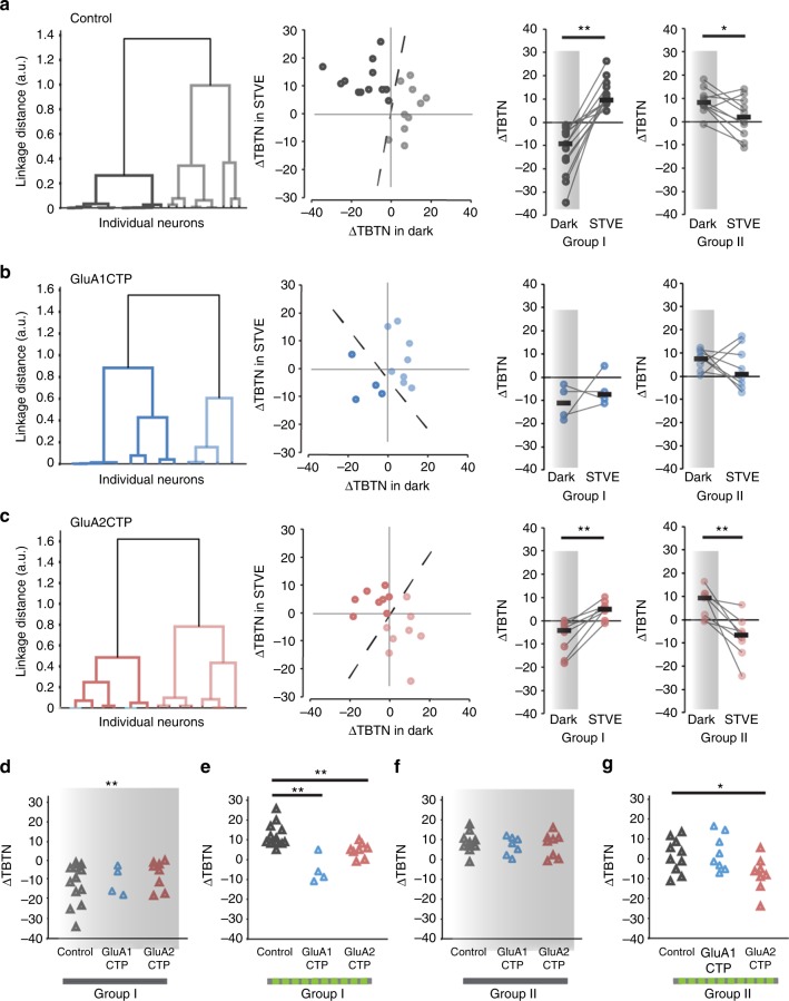 Fig. 6. Cluster analysis of experience-dependent changes in TBTN in individual excitatory neurons. a Left: Dendrogram of unsupervised hierarchical cluster analysis of control excitatory neurons based on ÎTBTN in STVE versus dark. Middle: Scatter plots of ÎTBTN in response to STVE versus dark in individual neurons for Group I and II excitatory neurons. Right: Summary of ÎTBTN in dark and STVE for Group I and II control neurons. b Cluster analysis of GluA1CTP-expressing excitatory neurons. c Cluster analysis of GluA2CTP-expressing excitatory neurons. *Pâ<â0.05, **Pâ<â0.01, Wilcoxon sign rank test. d- g Summary data of ÎTBTN in response to dark (d, f) and STVE (e, g) in group I (d, e) and group II (f, g) excitatory neurons. *Pâ<â0.05, KruskalâWallis test with post hoc MannâWhitney U test |