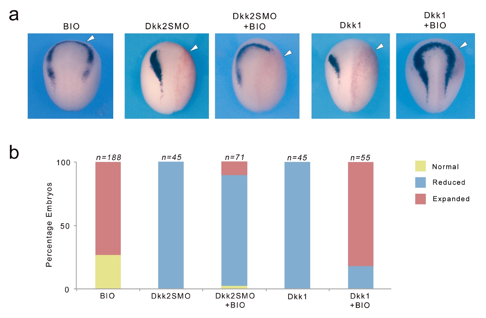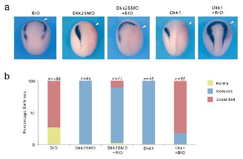 Figure 8. Dkk2 mediates its activity independently of GSK3. (a) BIO treatment (10 mM) expanded sox10 expression domain anteriorly. Unilateral injection of Dkk2SMO (30 ng) reduced sox10 expression a phenotype that cannot be rescued by BIO treatment. In contrast the Wnt inhibitory activity of Dkk1 (50 pg) on sox10 expression was efficiently rescued by BIO treatment. The injected side (arrowheads) is to the right as indicated by the presence of the lineage tracer (Red-Gal). Dorsal views, anterior to top. (b) Quantification of the phenotypes. The number of embryos analyzed (n) is indicated on the top of each bar. |